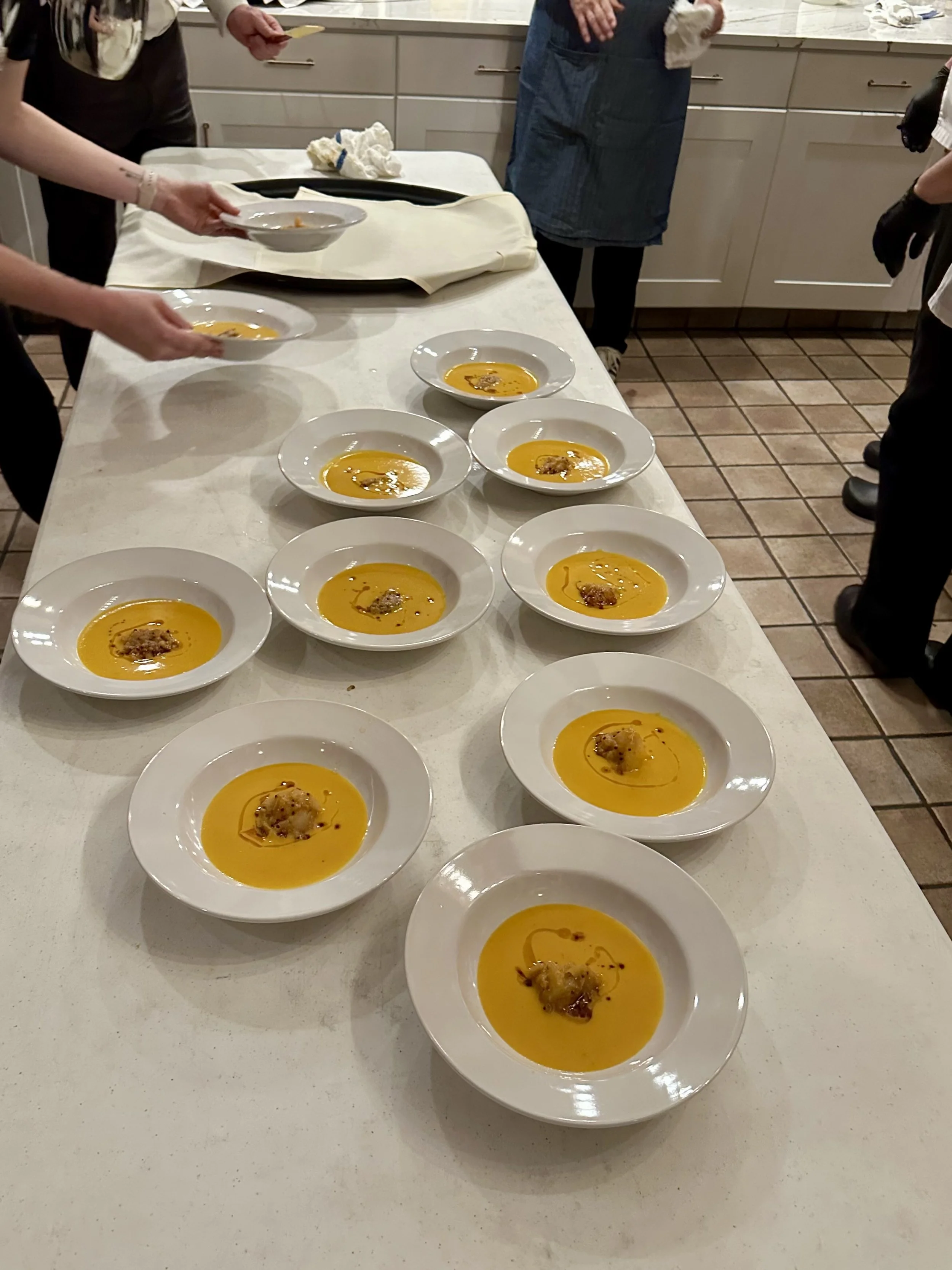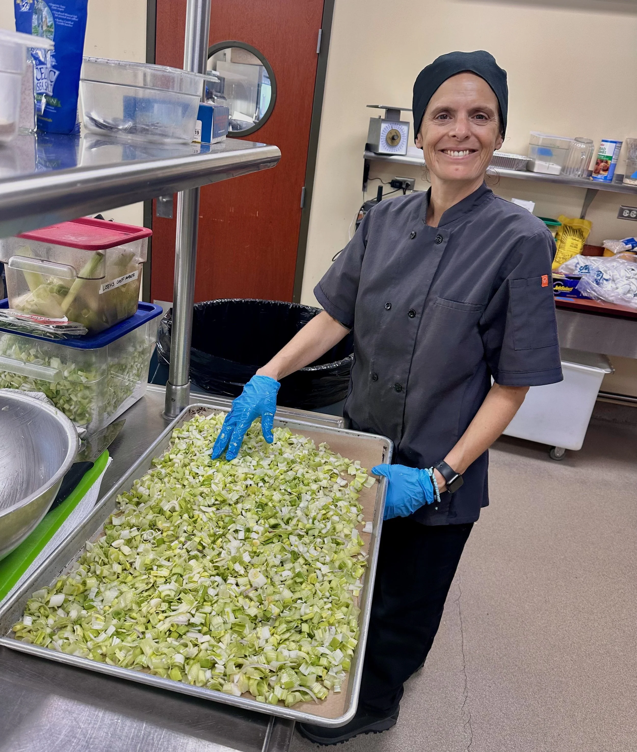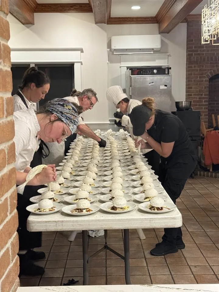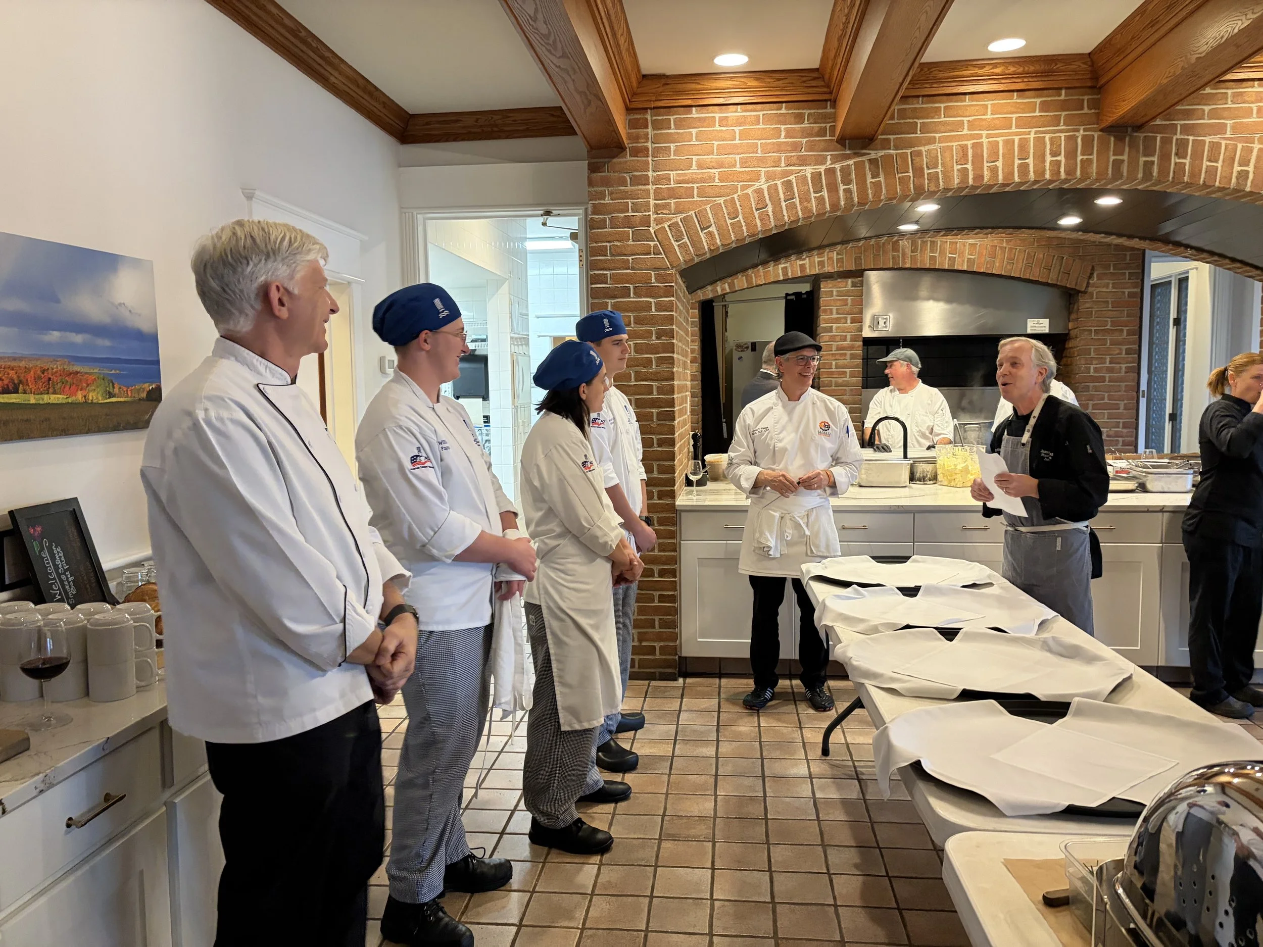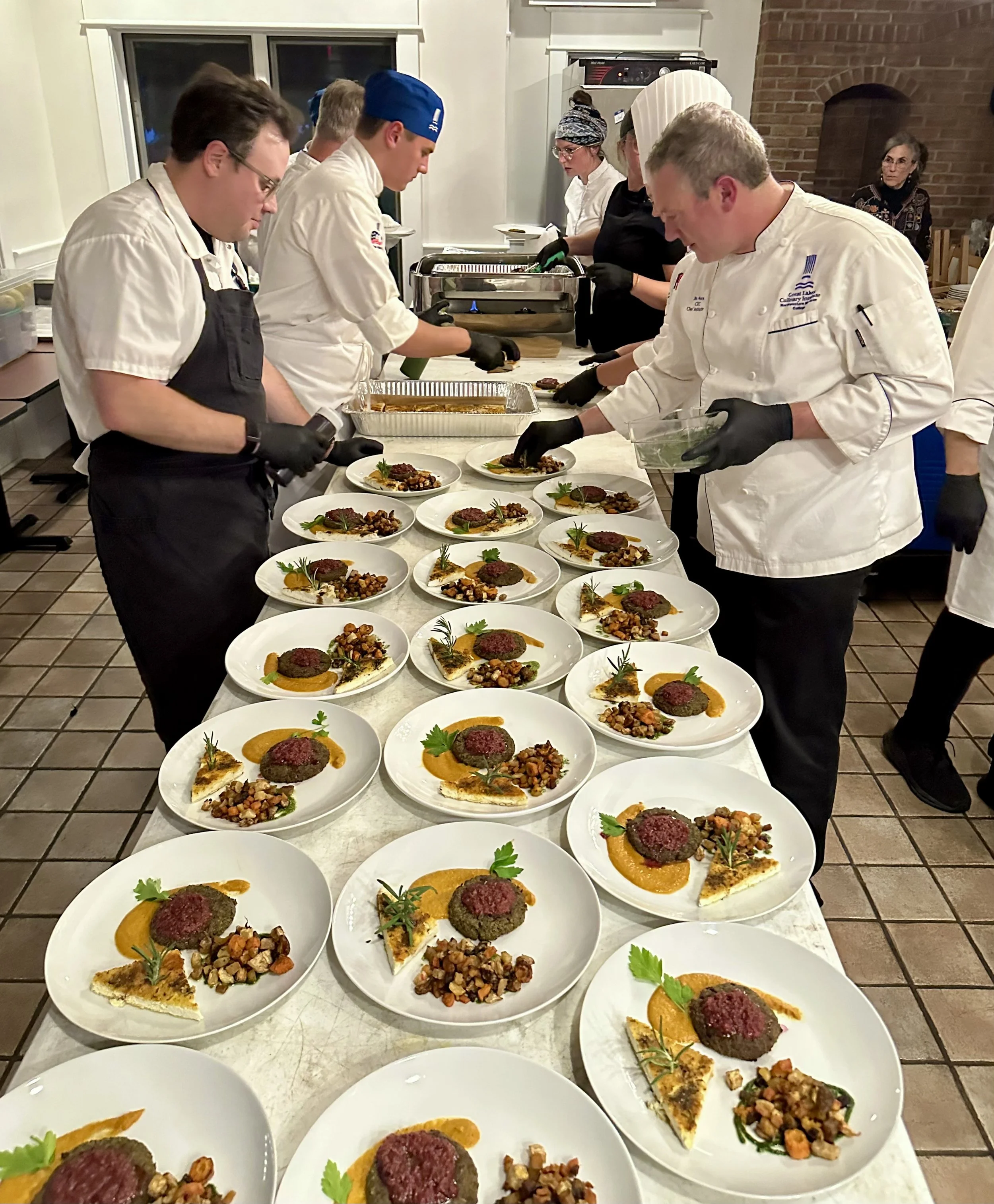 When we arrived at the Great Lakes Culinary Institute, which had generously opened its doors for the event, we were greeted by Chef Les Eckert and her remarkable staff. For two full days, we prepped in their kitchens overlooking Grand Traverse Bay, joined by GLCI chefs and students who eagerly stepped in to help with plating, service, and every small detail that would bring the dinner to life.
