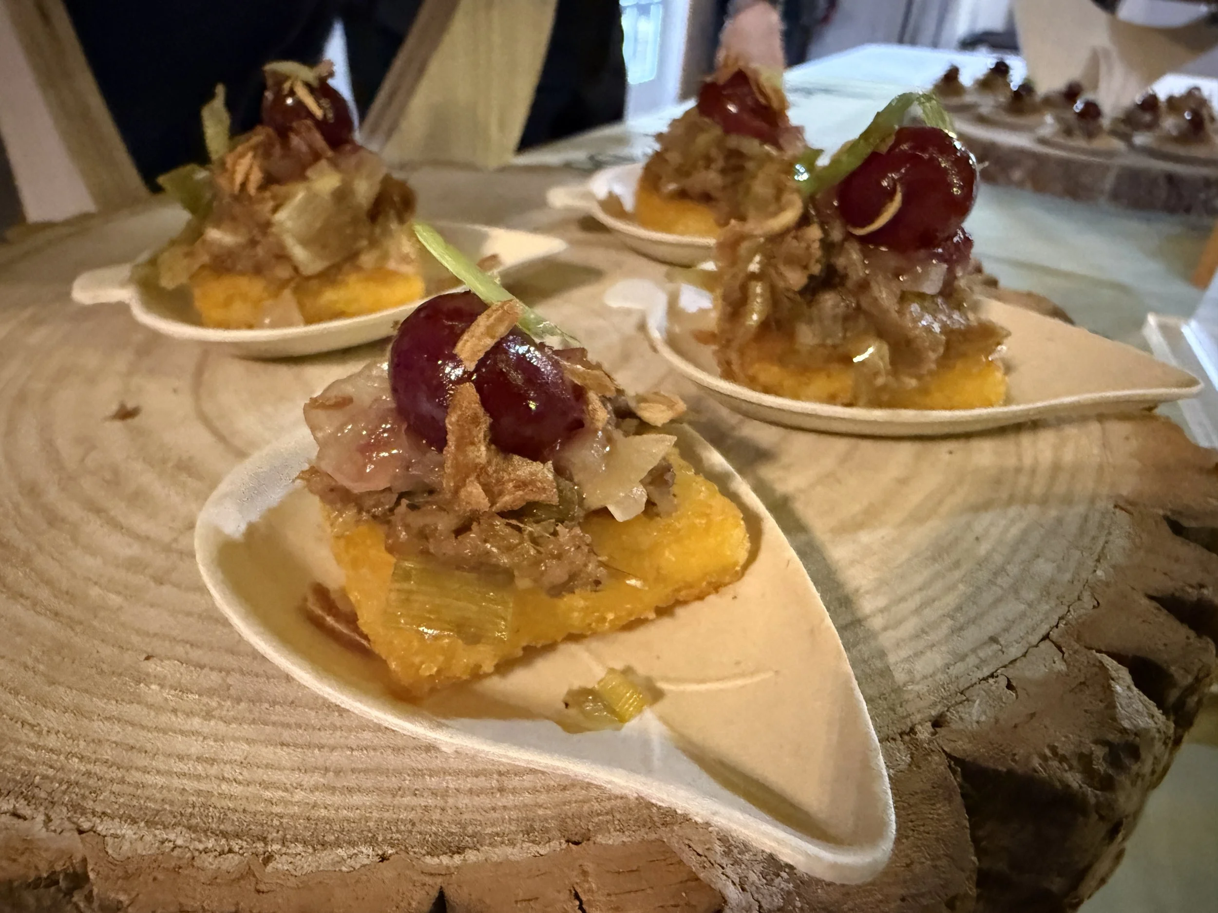 Leek & Walnut Pate on Polenta with Balsamic Roasted Grapes, Onion Relish & Shallots