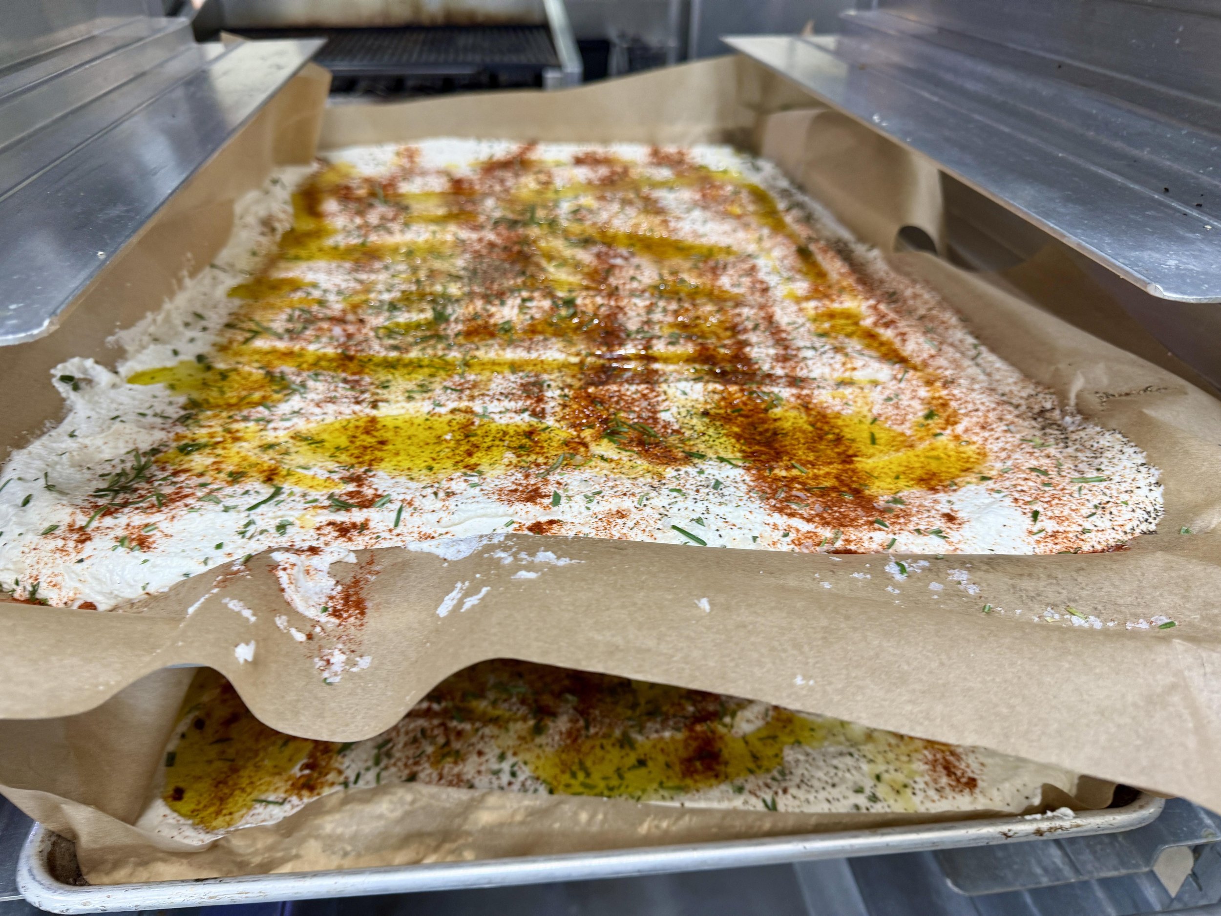 Spread onto a lightly-oiled parchment-lined small baking dish. Sprinkle with paprika rosemary, sea salt, black pepper and olive oil. Lay a sheet of parchment on top.